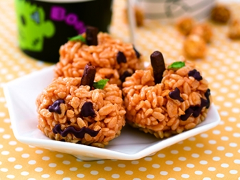 Change function to “Keep- Warm”. Stir in peanut butter and crispy rice. Remove and rest until slightly cool. Quickly shape into little pumpkins with hands. Add biscuit stick as stem.