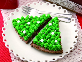 蛋糕取出,降温后切成三角形小块,唧上朱古力忌廉,放上糖珠装饰,完成。