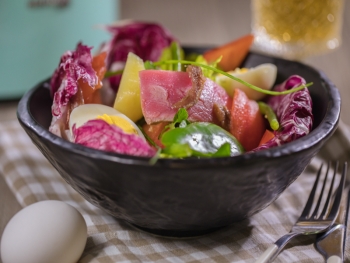用配菜伴碟(橄欖、鯷魚,雞蛋、香草和生菜)。 上碟前淋上油醋汁。