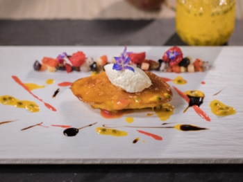 <摆盘>在芒果上放椰子雪糕,用切好的异国水果伴碟。