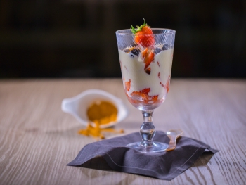 倒入覆盆子上,加上少許肉荳蔻,並用薄荷裝飾。