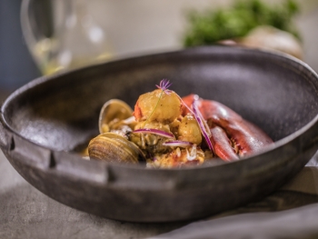 龍蝦蒸2分鐘,放入冰箱保存。用鹽和胡椒,小牛舌加鹽、胡椒、一半咖哩醬和酒,低溫慢煮12小時。煮好後牛舌留在袋中放涼。將牛舌頭切成小方塊,從袋子裡取出的汁料將用來煮蛤蜊,並加入餘下的酒和咖哩醬。