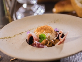 煙熏小牛雞蛋、雞油菌和伊比利亞火腿