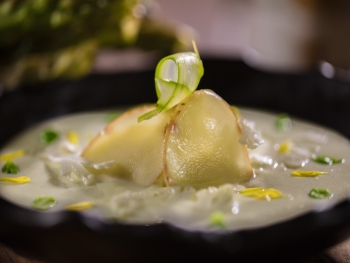 把剩下的蘆筍和雞湯、洋蔥、蔥粒一起放在小砂鍋裡。