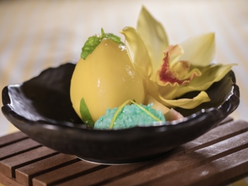 將白桃切成四分之一,每杯放三塊桃肉,並加上羅勒雪葩。