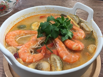 将草菇、茄子、鱼露、指天椒、柠檬汁、香茅、红葱头及冬荫功酱放入上汤内煮滚。