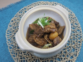 用变频万用养生锅爆香所有香料,加入羊腩、冬菇、马蹄、调味料及水,用慢火炆约45分钟後(视乎羊腩实际情况而定)加入枝竹。