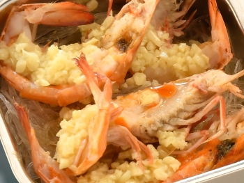 粉丝放於食物容器内,铺上中虾,将调好味的蒜茸铺於虾上。