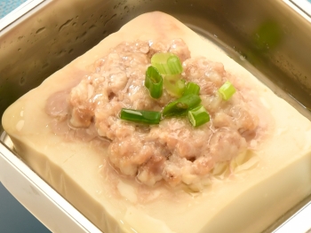 Cut tofu into slices, dry with kitchen paper. Use small spoon to scoop a shallow dent in the middle, stuff in minced pork. Place tofu in container.