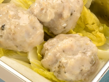 再将娃娃菜平均排放好在食物容器内,放上鲮鱼肉球。并放好在食物容器内。