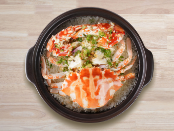 加入花蟹、蒜茸、炸蒜茸及白葱段後,电陶炉调至300W再煮8分钟後取出,离火焗3分钟。