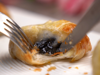 Place sweet rice dumplings on pastry triangle, brush with egg wash, tuck in edges underneath, and trim off excess pastry.