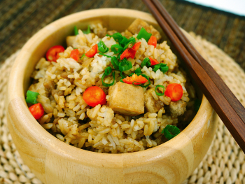 完成「煮饭」程序後,加入盐及木鱼丝,将全部拌匀,即成。