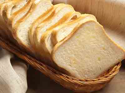 在麵包桶中先加入水,再放糖、鹽、奶粉、牛油,最後加高筋麵粉,將麵包桶裝入自家制麵包機內。