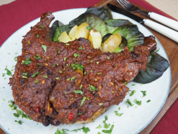 If you are looking for a more appealing presentation of the dish, plate the chicken on a baking tray, add the sauce and bake at 200°C (using Bake mode, with dual heating of upper and lower elements) for around 3-4 min till the chicken skin turns golden.