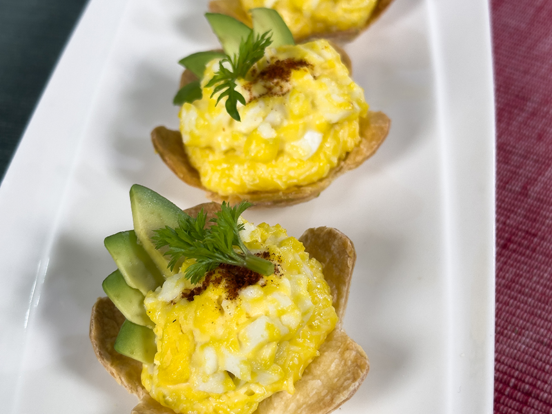 将适量蛋沙律放进墨西哥脆饼杯中,并铺上牛油果片。