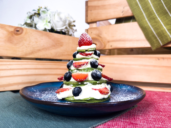 开始组装圣诞树,先放最大块班戟,挤上忌廉,放上水果,再叠一层班戟,重复此步骤直至堆出圣诞树造型。