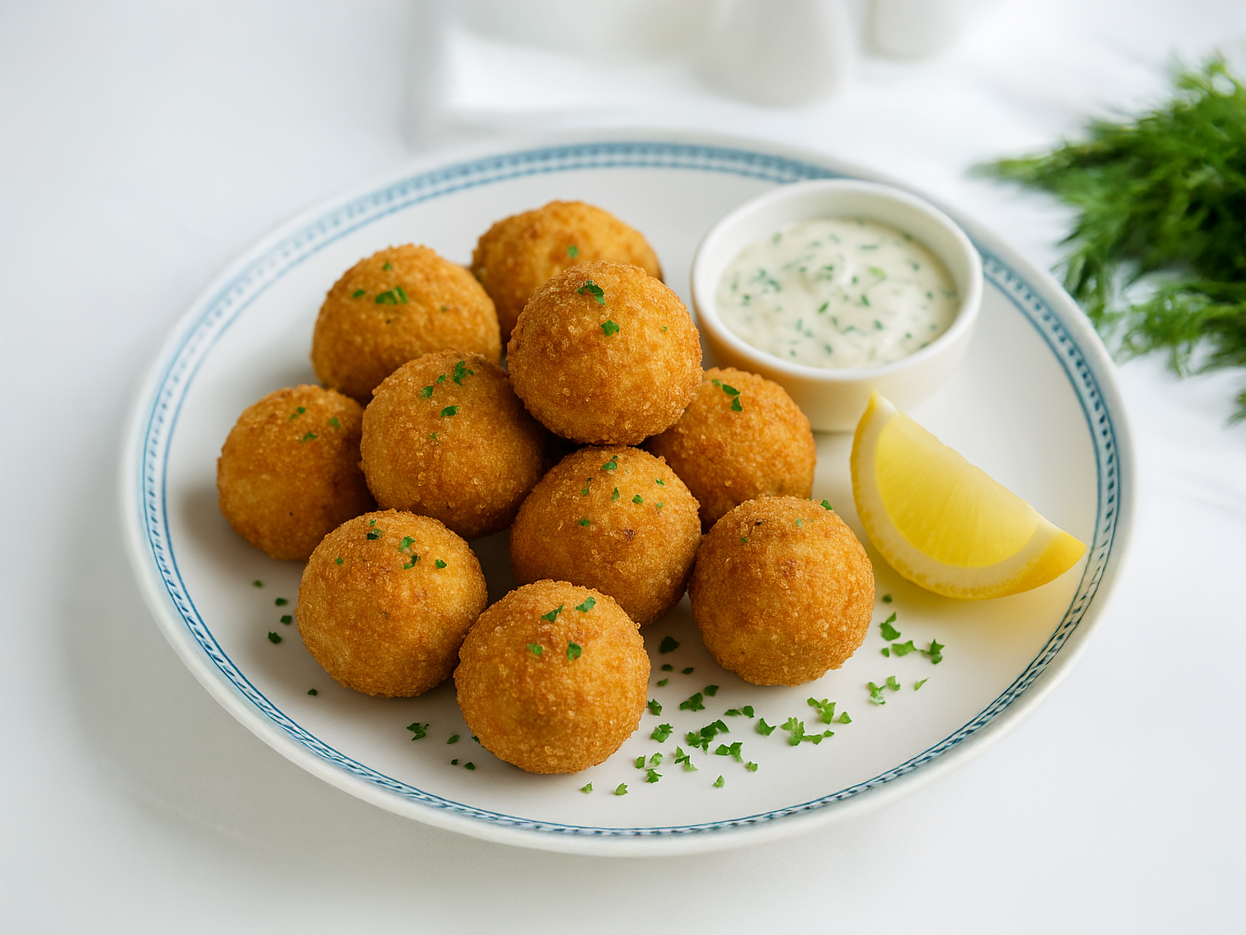 把鱼蓉搓成乒乓球大小,放入面包糠中滚动,均匀喷上煮食油。
